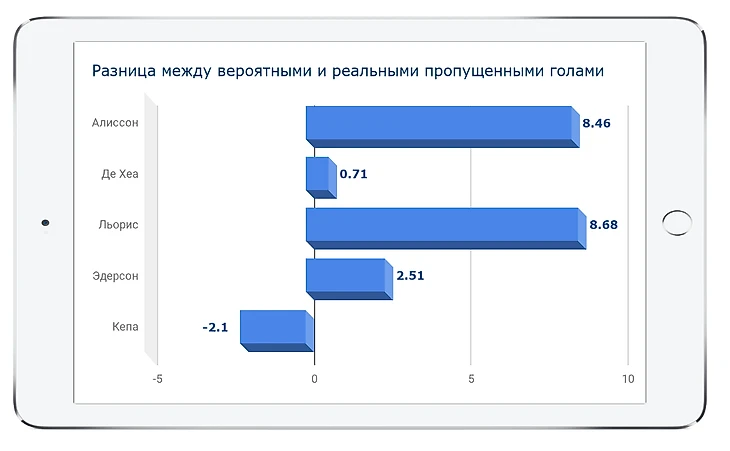 На диаграмме ниже вероятность гола ударом из пределов вратарской. В этом рейтинге Алиссон делит пальму первенства с испанским вратарем "Челси". Похоже, лондонский клуб выложил 80 миллионов евро именно за это умение Кепы, но для сбалансированности современному голкиперу все-таки маловато умения отражать только удары в упор.