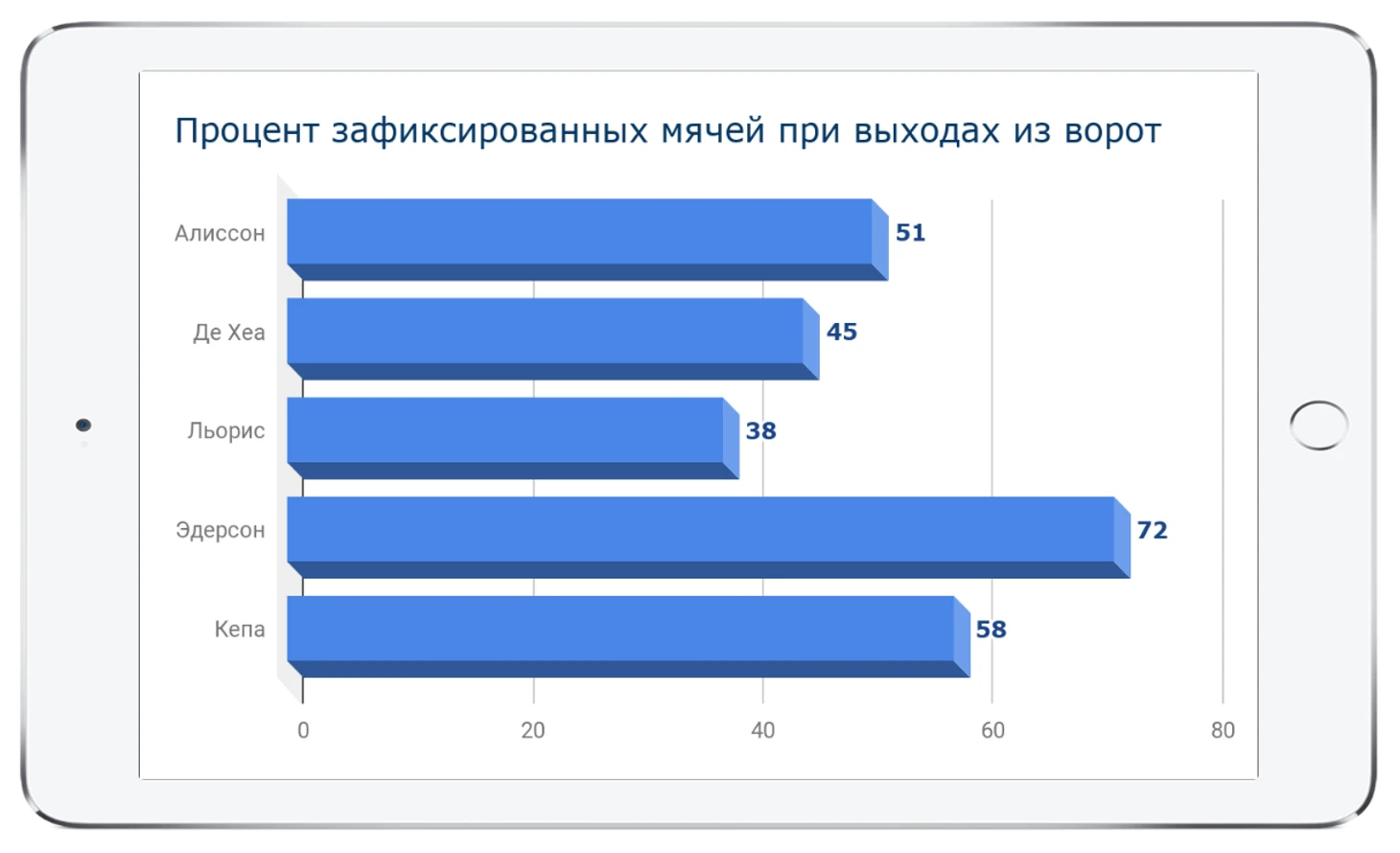 В оценке игры вратаря нельзя обойти стороной и игру на выходах. Лучше всего характеризует этот критерий действий голкипера процент зафиксированных мячей, ведь именно пойманный намертво мяч лишает соперника возможности потенциального подбора и, напротив, гарантирует команде владение или возможность убежать в быструю контратаку. На графике заметно очевидное лидерство Эдерсона, хорош в этом компоненте и Кепа, Алиссон тоже в порядке.