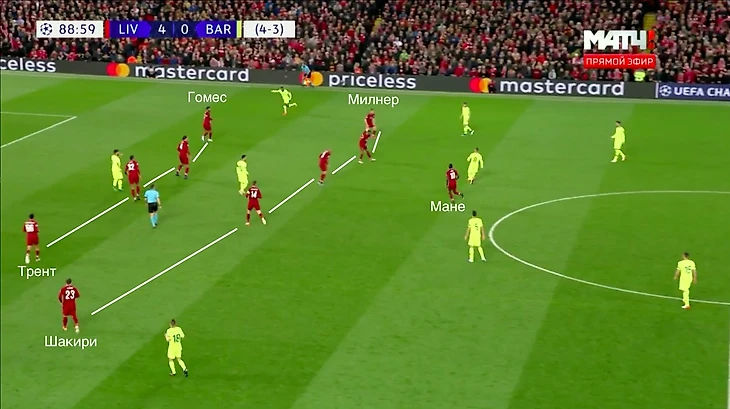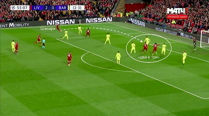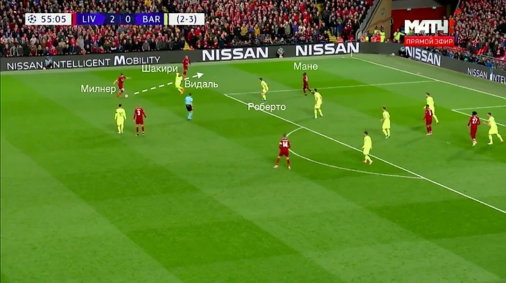 Шакири оказался вместе с Мане на одном фланге и возникла ситуация «три в два» на фланге. Милнер отдаст на свободного Шакири