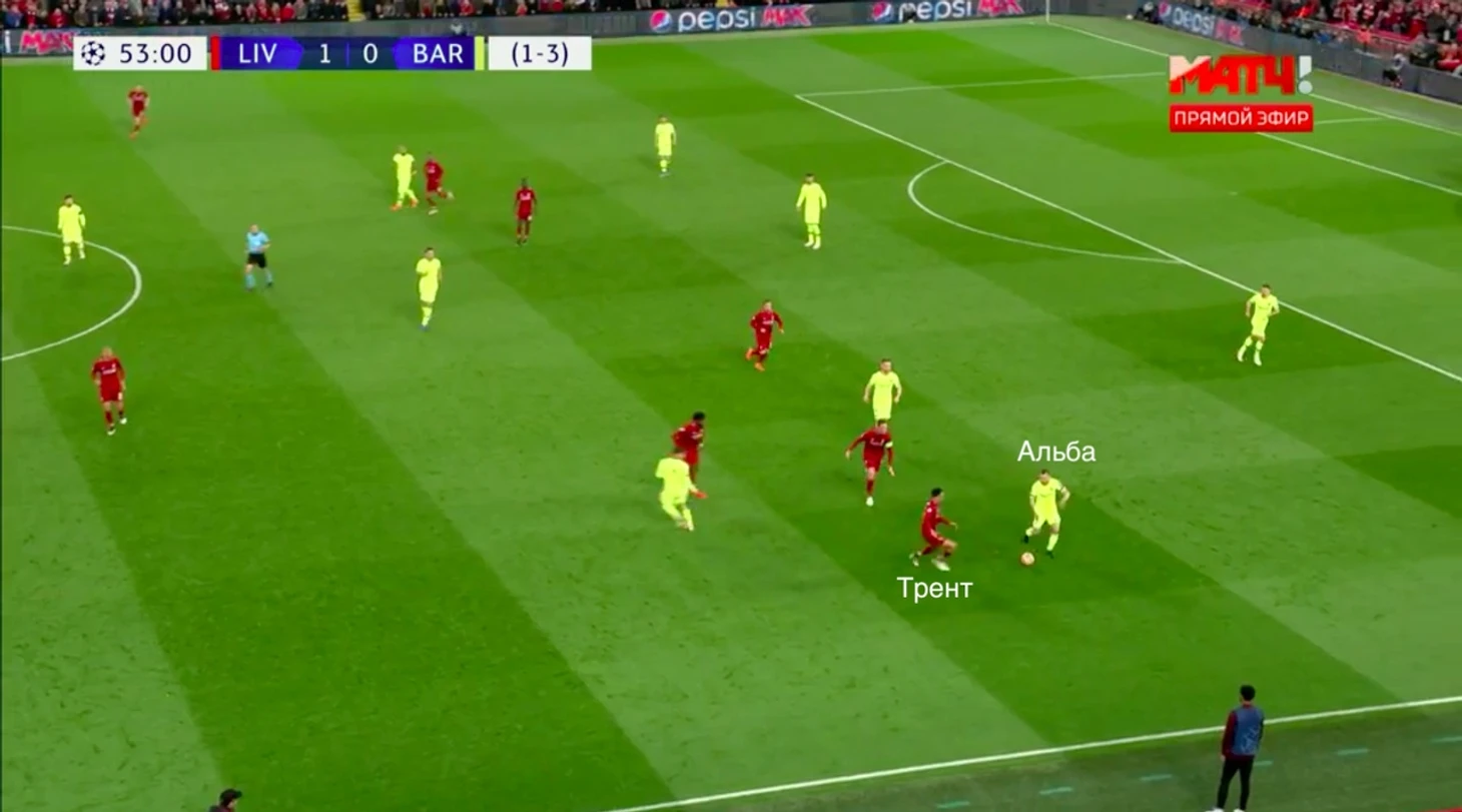«Ливерпуль» давит. Альбе некуда пасовать. Жорди пробует обыграть Трента, вместо того, чтобы выбить мяч