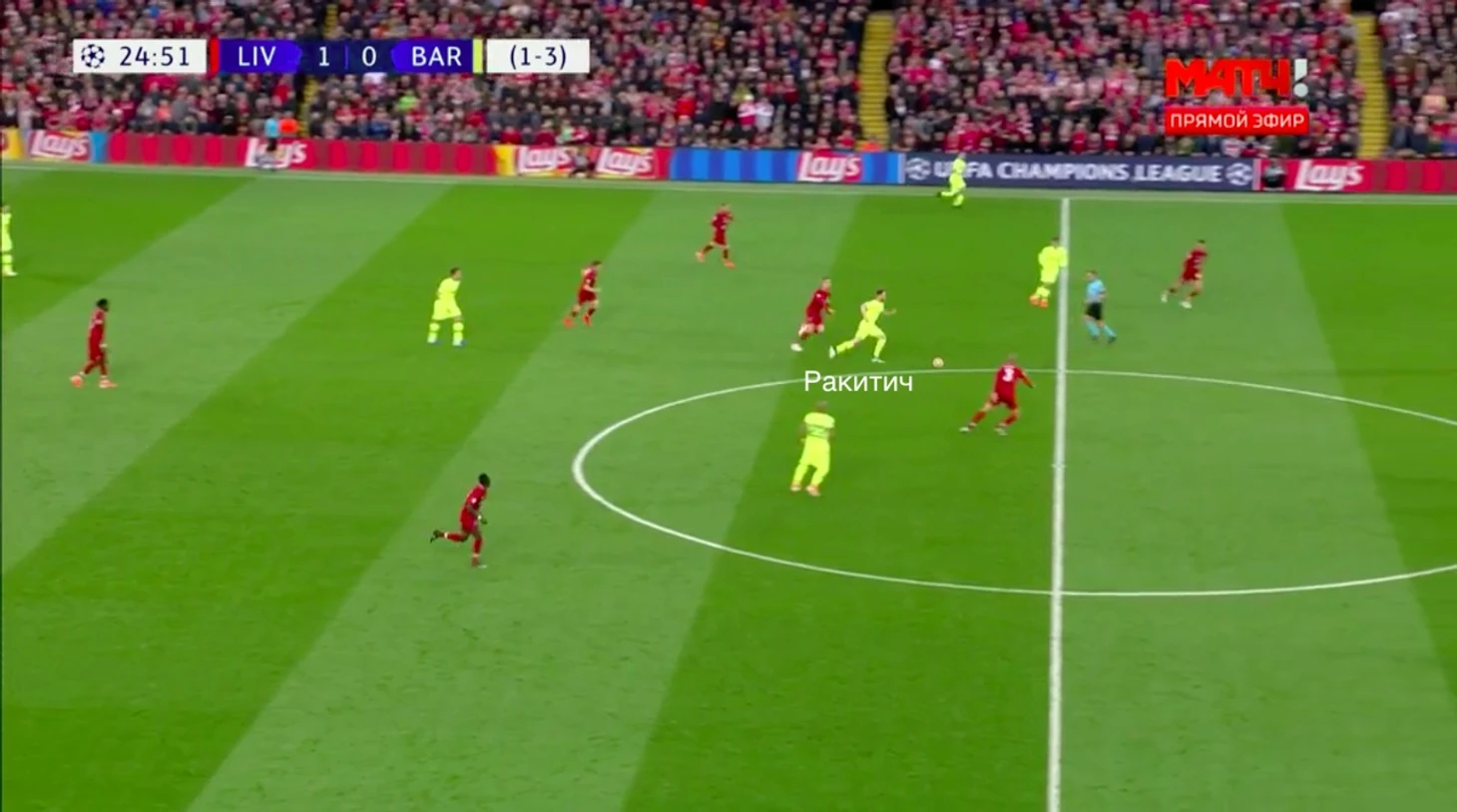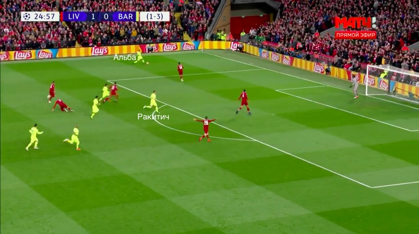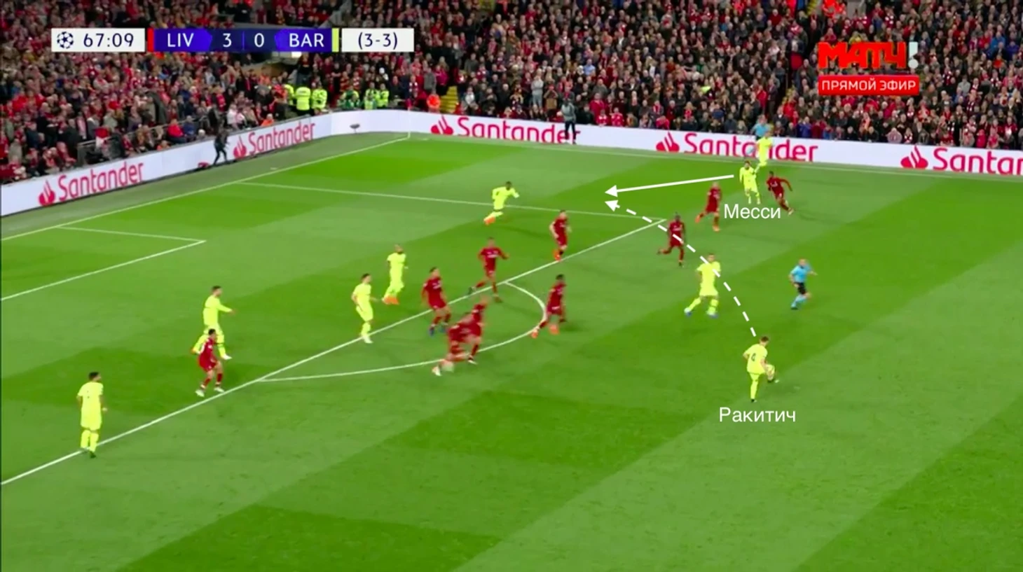 Ракитич сделал заброс на Месси и поймал «Ливерпуль» на искусственном офсайде. Лео выбежит на ближнюю штангу и не реализует шанс.