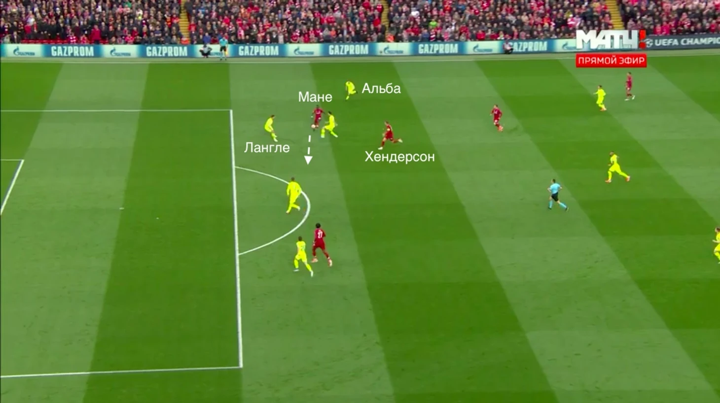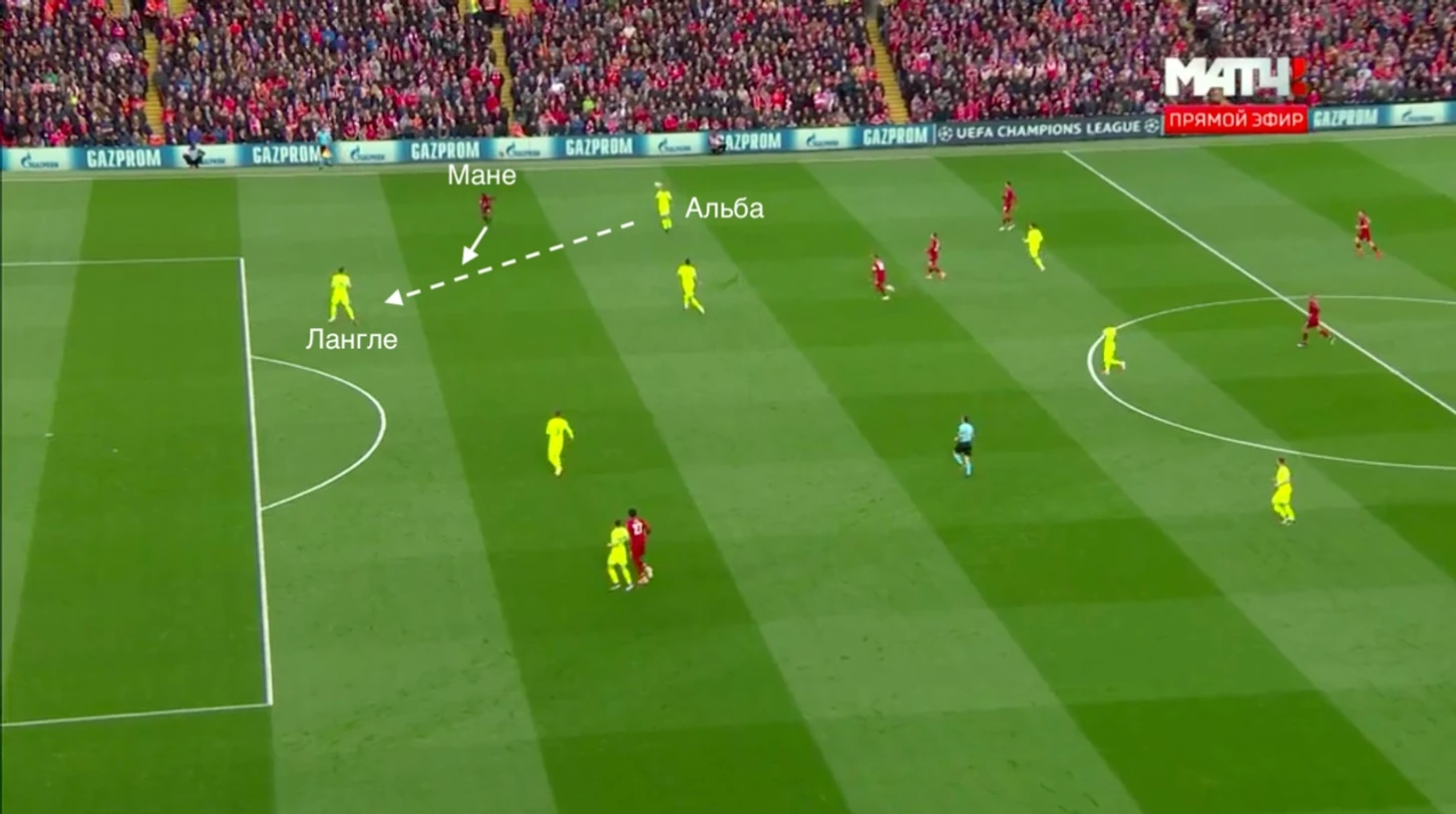 Матип не добил до Мане. Альба делает скидку на Клемана Лангле, не замечая Садио. Мане прочитает пас Жорди и перехватит мяч
