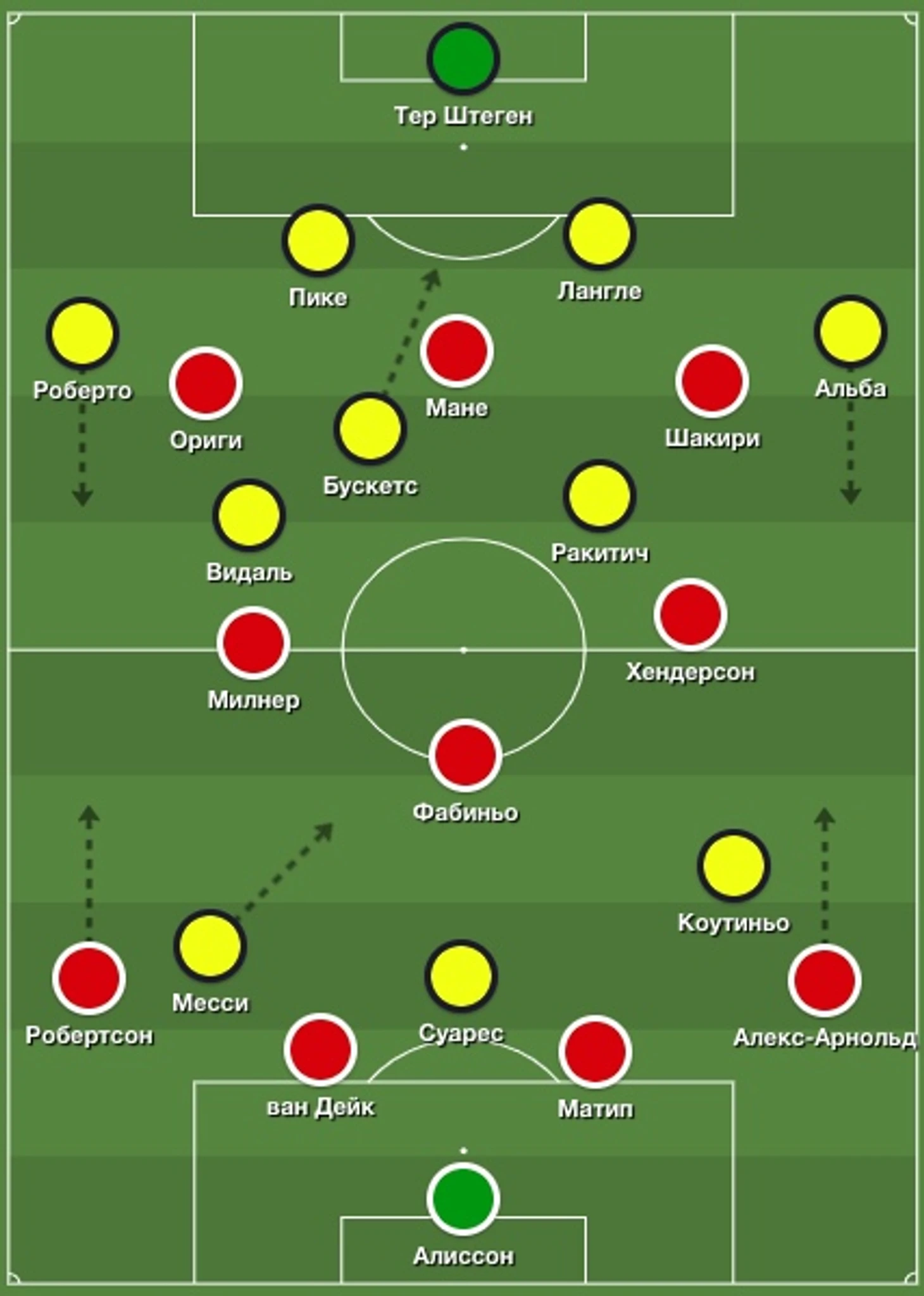 Юрген Клопп потерял лидеров: Мохаммеда Салаха и Роберто Фирмино (еще раньше). На «Камп Ноу» немец решил поэкспериментировать и форварда сыграл Джорджиньо Вейналдум. На «Энфилде» Клопп выбрал Дивока Ориги и Джердана Шакири. Они сыграли в тройке нападения вместе с Садио Мане. В центре вышел Джеймс Милнер, Джордан Хендерсон и Фабиньо. А справа в защите появился Трент Александер-Арнольд.