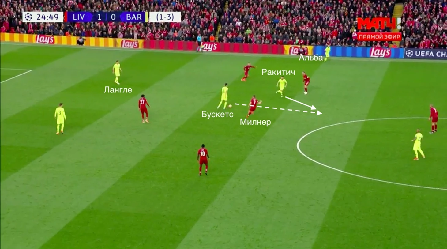 Бускетс с мячом. Милнер давит. Читается примитивная передача на Альбу, но Бускетс отдаст на Ивана Ракитича. Хорват открылся в свободную зону, а испанец тонко выполнил передачу на ход