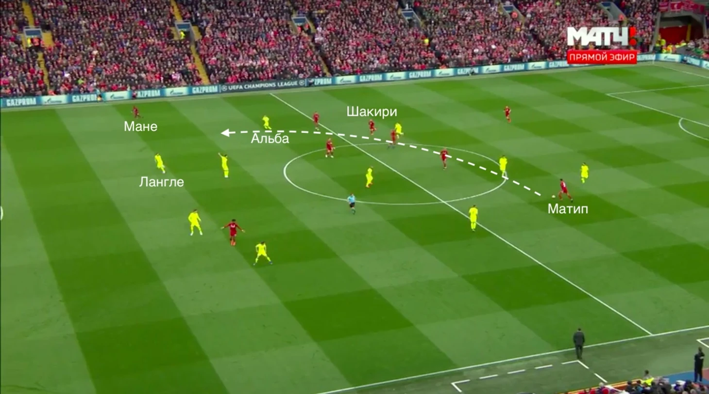 Жоэль Матип переводит мяч на Мане. Альба не замечает, что Садио поменял фланг и ориентируется на Шакири