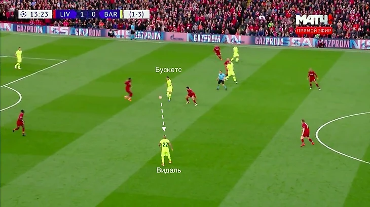 В этом эпизоде был офсайд, но столько времени и пространства Бускетсу давать нельзя. Он сразу отдаст важный пас, как в этом случае: