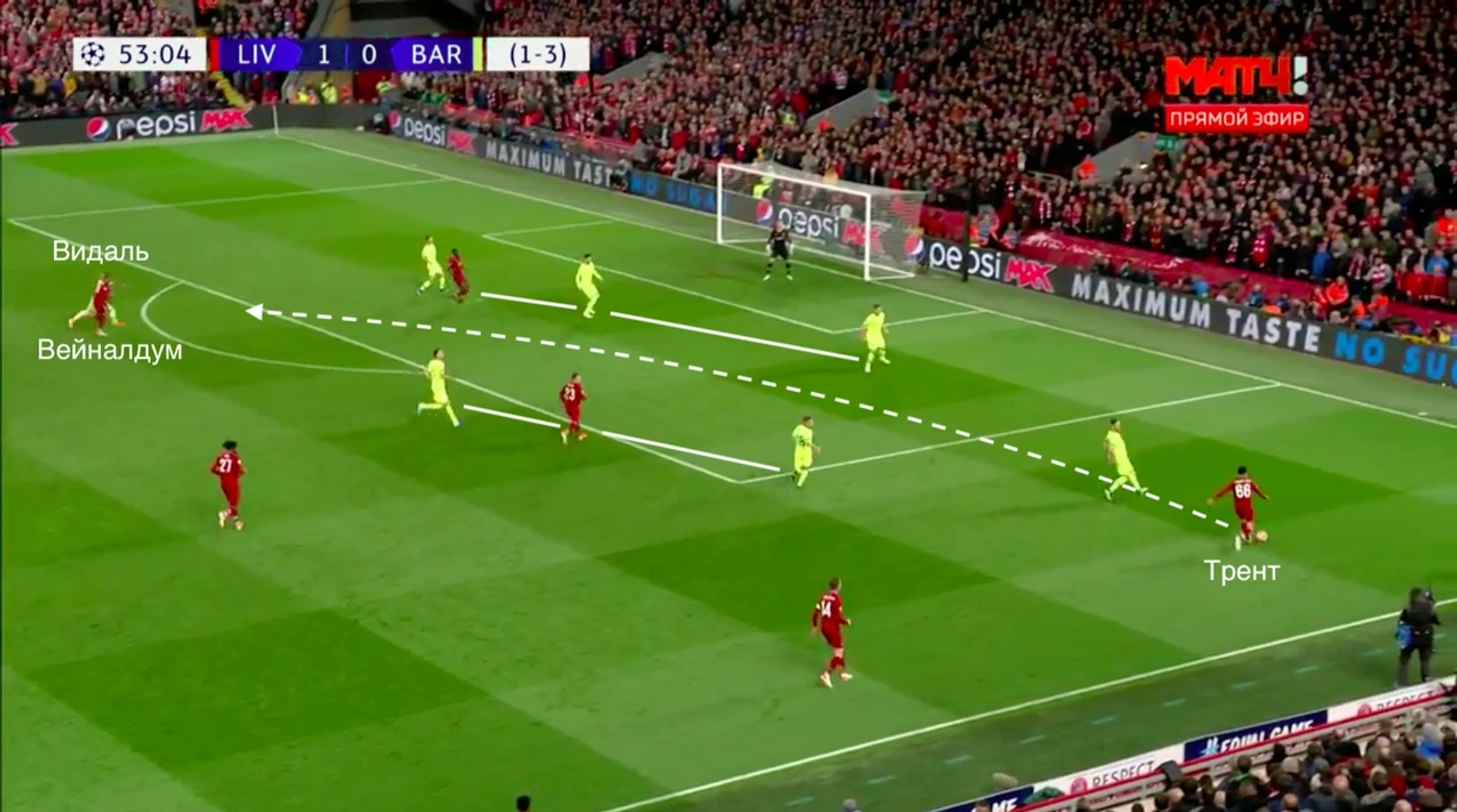 Трент прострелит, мяч заденет ногу соперника и пролетит штрафную через коридор. Алекс-Арнольд попал в тайминги, а быстрый Вейналдум опередил Видаля.