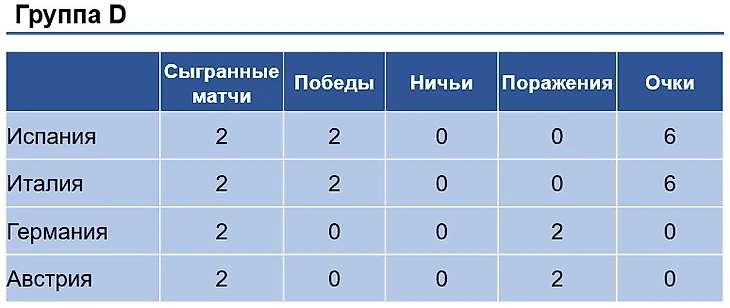 Ниже представлена таблица группы, в которой играют Испания и Италия