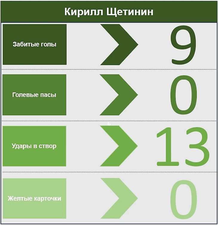 Полузащитник сборной Кирилл Щетинин занимает второе место в списке бомбардиров: он забил 9 мячей.