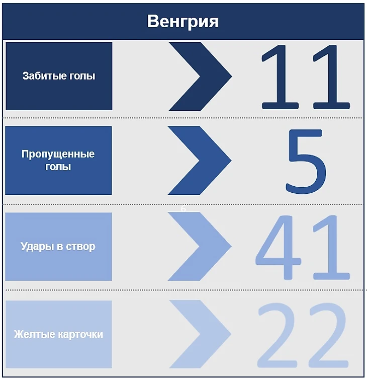Скажу честно, это единственная команда, которую я изначально не планировал включать в число «темных лошадок». Я даже не смотрел историю их встреч и статистику. Но за то время, что я писал эту статью, они грохнули Португалию и Исландию и уже обеспечили себе участие в ¼ финала. Однако. до этого команда шла не столь уверенно, в отборочном раунде команда вничью сыграла с Румынией, а в элитном раунде уступила бельгийцам. Статистика также не самая мощная: 11 забитых мячей и 5 пропущенных. Нанесли 89 ударов и 41 в створ. Но по одному показателю Венгрия бесспорный лидер – количество фолов, их команда совершила 148 штук. А их игрок, Махай Ката, вместе с итальянцем Эспазито, является лидеров по числу фолов – 20 штук.