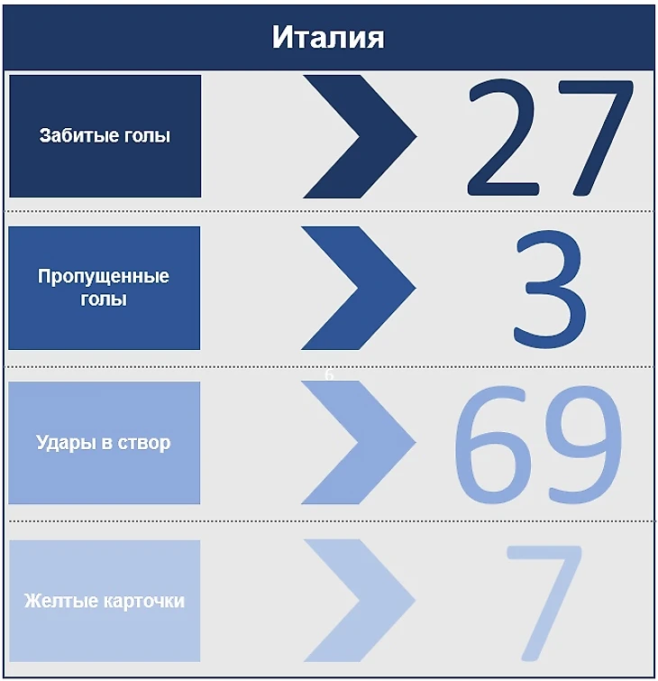 В этом году команда достаточно уверенно идет по турниру, одержав все победы. Кроме того, команда занимает второе место по количеству забитых мячей – 27. При этом команда очень мало пропустила, всего 3 мяча. Италия 156 раз ударила в сторону ворот и 69 в створ. По этим показателям команда занимает 2-ое место. Точность ударов составляет 43%.