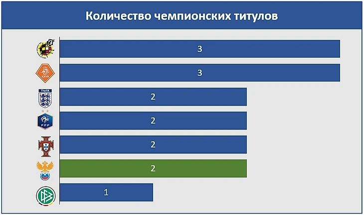 Наиболее титулованными участниками являются – Нидерланды и Испания, они брали титул по 3 раза. По два раза трофей брали Англия, Португалия, Франция и Россия.