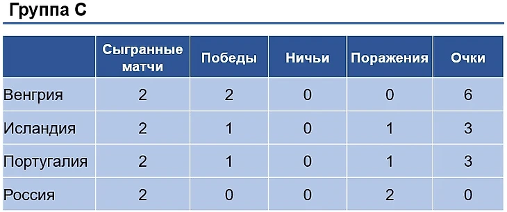 Ниже можно ознакомиться с таблицей группы, где играют Россия, Исландия и Венгрия: