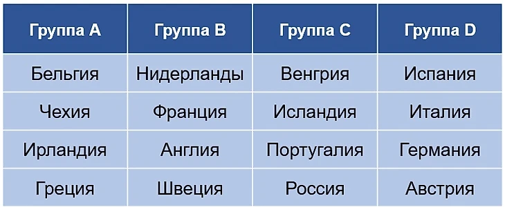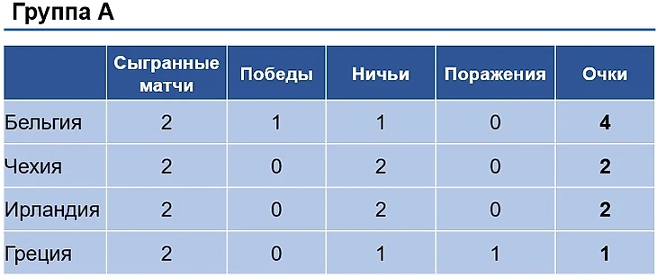 И конечно хочу отметить, что скорее всего, кто‑то из пары Бельгия и Ирландия скорее всего не выйдет из группы так как им играть очную встречу в 3-ем туре. Ниже можно ознакомиться с расстановкой сил в группе А.