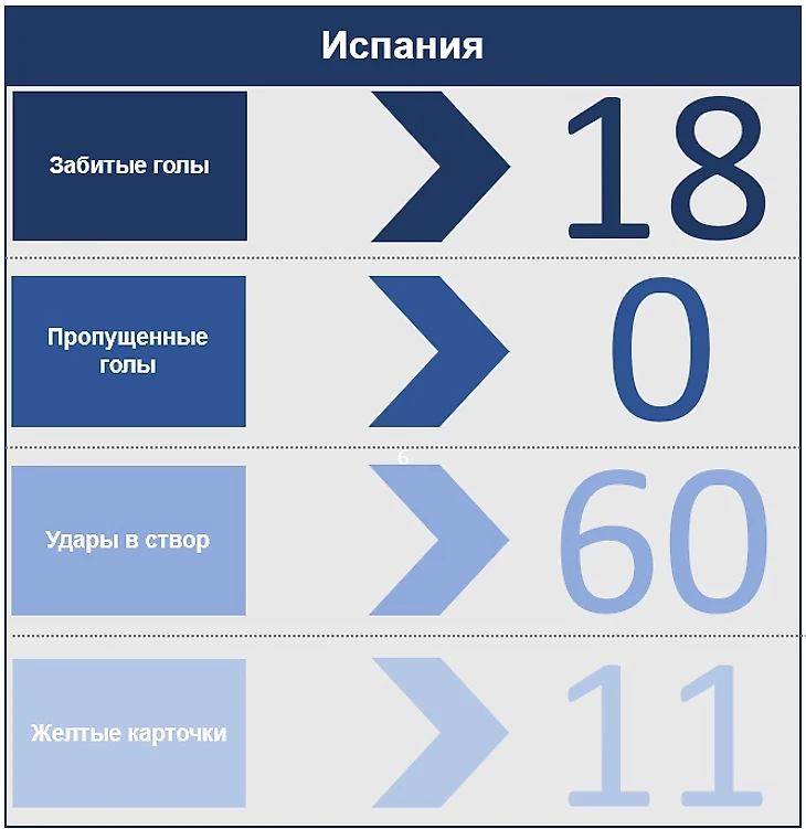 В нынешнем турнире команда идет не столь ярко как голландцы, но тоже весьма уверенно. Команда победила во всех своих матчах. Сборная Испании забила 18 мячей и не входит даже в ТОП-5 на турнире по этому показателю, но при этом пока не пропустила ни одного мяча. По количеству ударов в сторону ворот команда также не входит в ТОП-5, ударив всего 131 раз. Однако занимает 4‑ое место по количеству ударов в створ, они били в створ 60 раз.