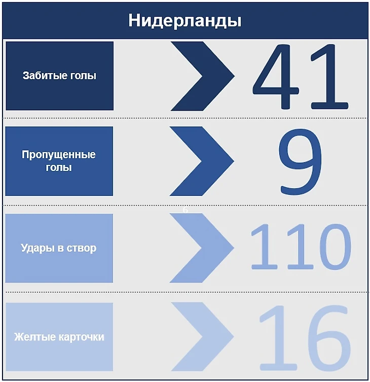 В этом году команда «идет катком» по турниру. Были одержаны победы во всех матчах. В рамках отбра и финальной части Голландцы забили 41 мяч, что в 1,5 раза больше, чем у ближайшего преследователя, Италии. Ровно такая же статистика по ударам – 209 против 156 у ближайшего преследователя, а по ударам в створ статистика поражающая – 110 ударов, что уже на 60 % больше чем у ближайшего преследователя. Показатель точности ударов составляет 53 %, выше только у Исландцев. Кстати, самую крупную победу на турнире Нидерландам одержать не удалось. Украина обыграла сборную Гибралтар 11-0. Нидерланды смогли одолеть сборную Лихтенштейна лишь со счетом 10‑1, и эта победа стала лишь второй по величине на турнире.