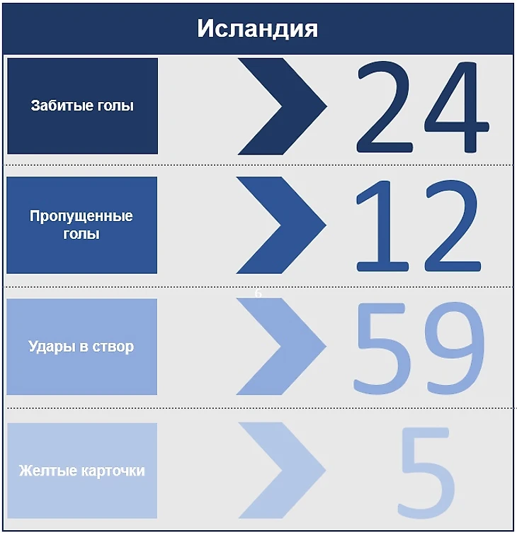 Команда занимает четвертое по количество голов, команда забила 24 мяча. Кроме того исландцы нанесли 109 ударов в сторону ворот и 59 ударов в створ (по этому показателю команда занимает 5‑ое место). Кстати, точность ударов составляет 54% – это один из самых высоких показателей турнира.