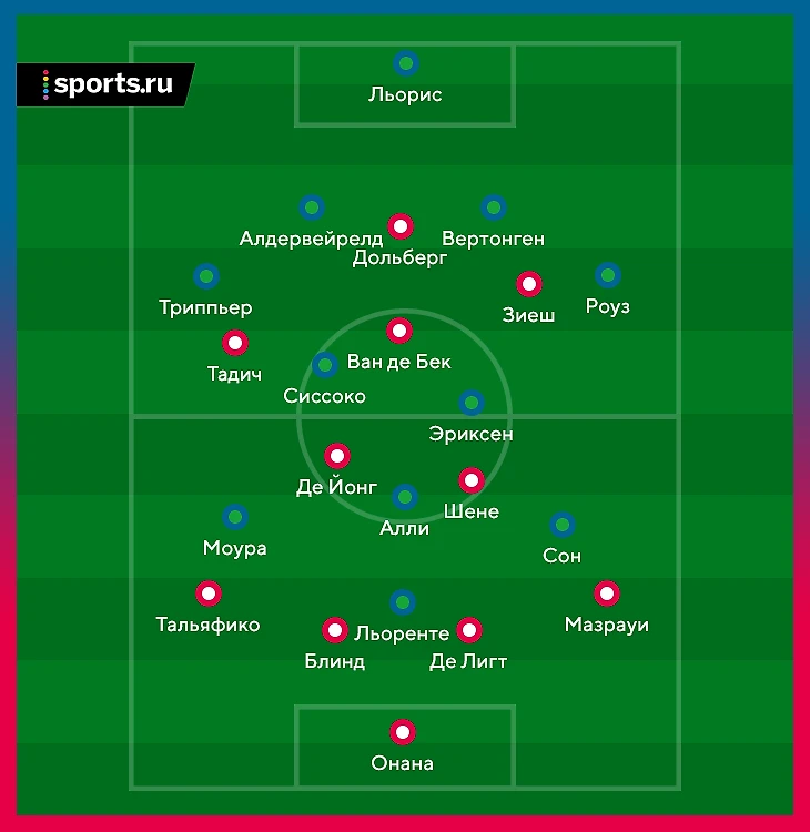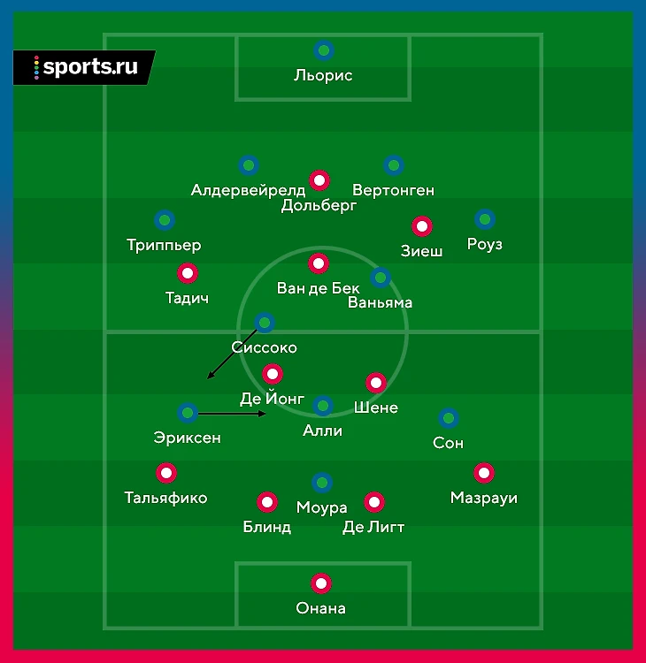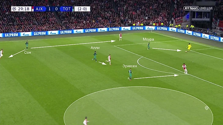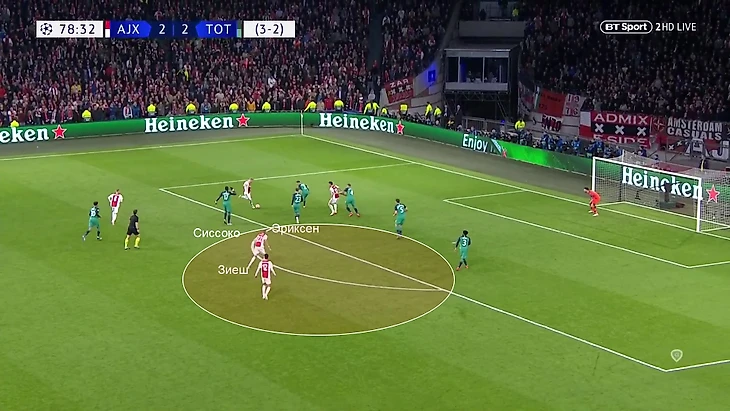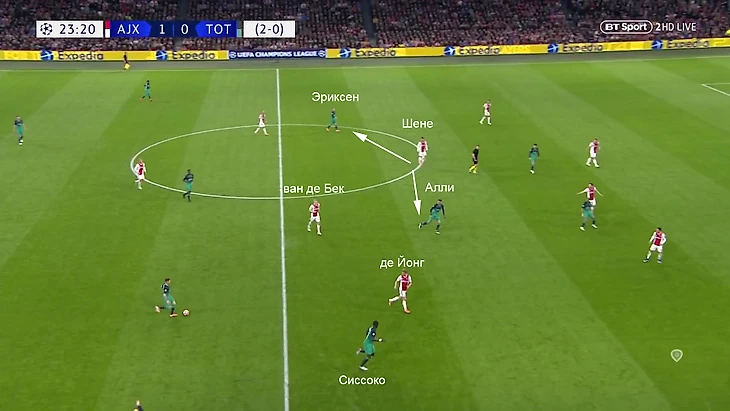 Благодаря движению Эриксена в первой стадии «Тоттенхэм» захватил территорию и полный контроль. «Аякс» терялся в попытках прессинговать датчанина – Шене и де Йонг опасались выдвигаться так высоко, а ван де Бек играл с Сиссоко. После пары неудачных попыток «Аякс» сбавил давление.