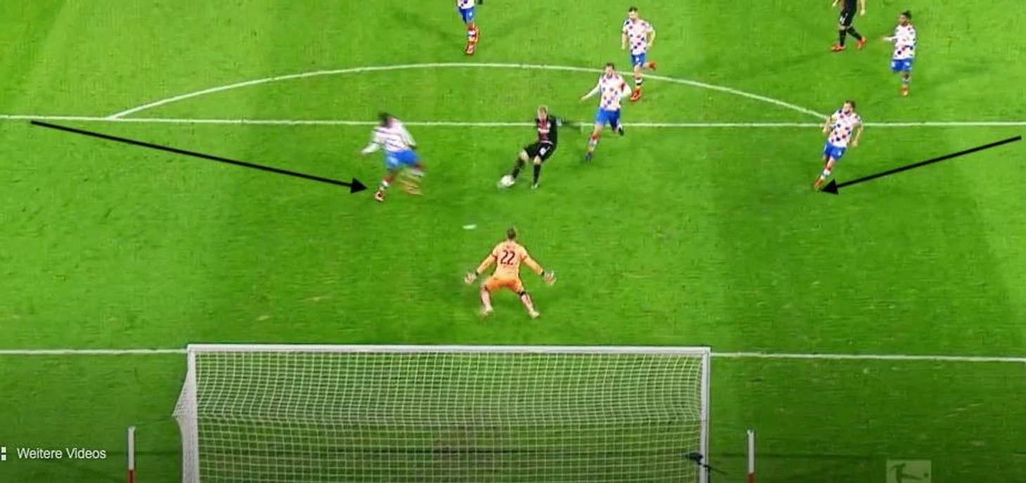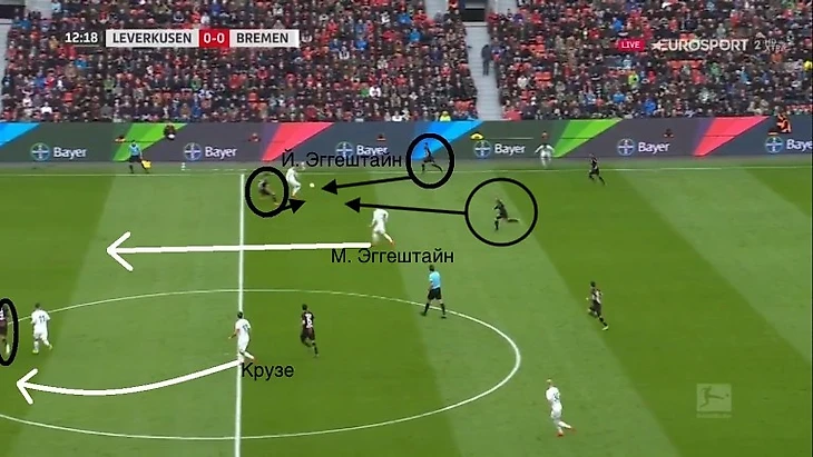 Футболисты «Байера» не успевают накрыть Йоханнеса Эггештайна, тот отдает передачу брату, Макси переводит мяч на Крузе и тот бежит открывать счет.