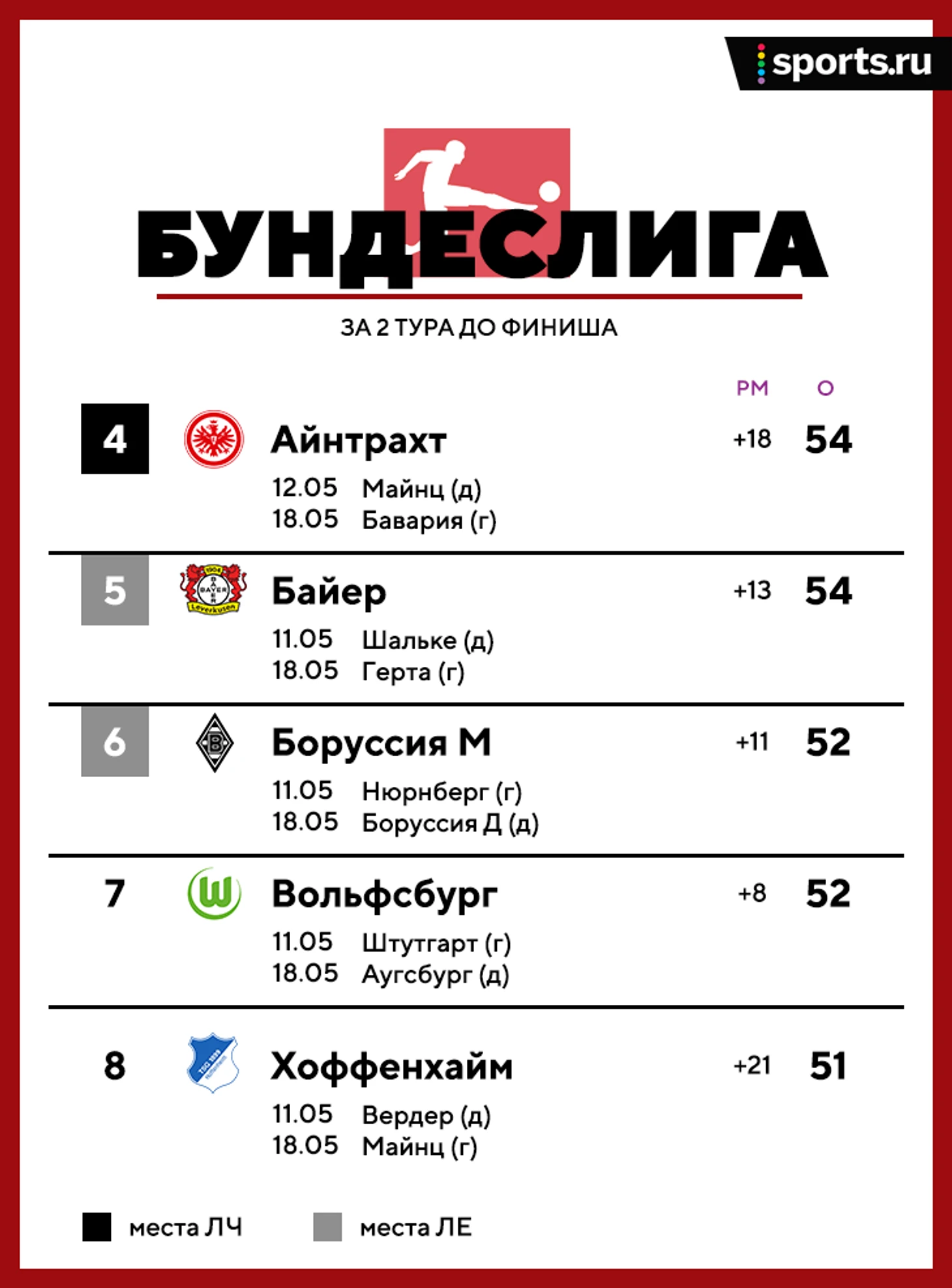 «Байер» ждут клубы с нулевой мотивацией. В первом круге леверкузенцы легко обыграли и «Шальке», и «Герту». Главный конкурент «Айнтрахт» в последнем туре едет в гости к «Баварии». Для «Франкфурта» это в любом случае испытание – даже если мюнхенцы к тому моменту оформят чемпионство. В этом сезоне «Бавария» дважды разнесла полуфиналистов ЛЕ с общим счетом 8:0.