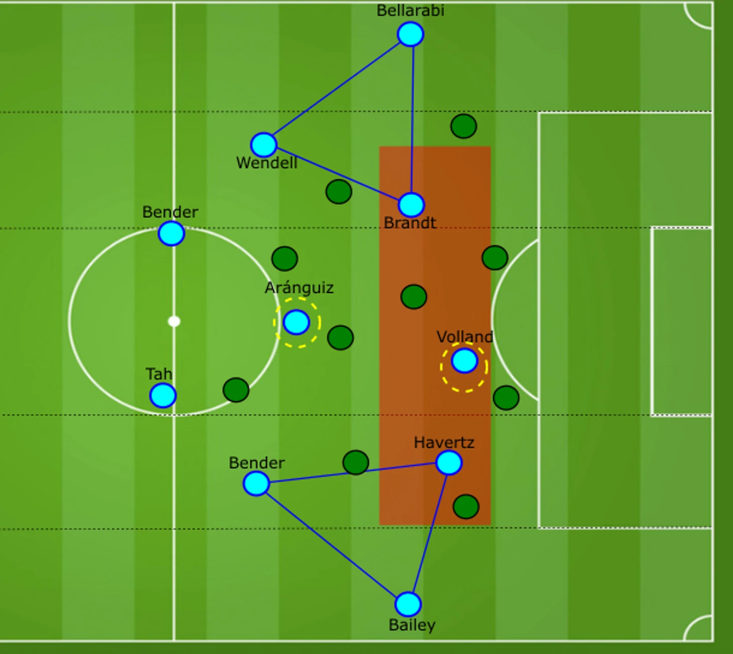В «Леверкузене» Бос немного модифицировал игру крайних нападающих. Если в «Боруссии» они были активными участниками почти каждой атаки и подтягивали остальную команду к чужим воротам, то в «Байере» фланговые игроки располагаются максимально широко друг от друга – так, чтобы у центрального нападающего (Фолланда) и атакующего полузащитника (Брандта) было больше пространства для маневра.