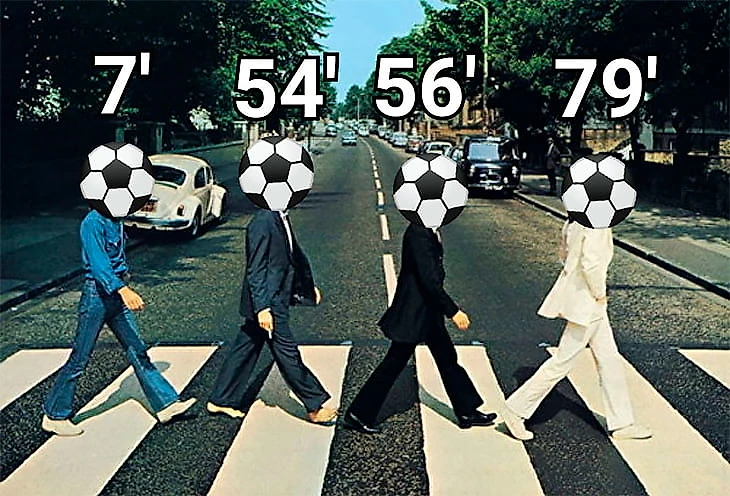 Когда Ориги забил четвертый, сразу появилась связь с ливерпульской четверкой: быстро нагуглил ту легендарную фотографию с битлами на зебре, подставил в фоторедакторе телеграма эмодзи мяча и добавил минуты, когда были забиты голы.