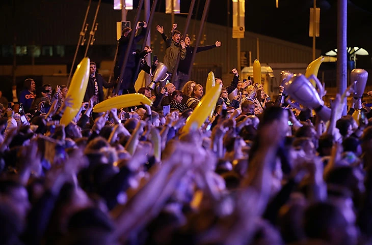 Первые полчаса сбора болельщиков празднование напоминало британский музыкальный фестиваль: не сильно одетая и пьяная молодежь, хруст пластиковых стаканов под ногами, ленивое подпевание музыке из колонок. Но ближе к 10 вечера, когда над Манчестером стемнело, к стадиону подтянулись фанаты постарше – в майках «Сити» из 1990-х – и даже семьи с детьми. Почти все притащили флаги, надувные бананы и акул с прошлогоднего парада. Собрание сразу стало превращаться в более радостное и адекватное мероприятие.