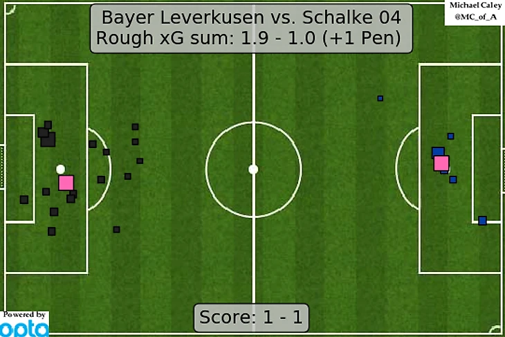 «Шальке», убегая в контратаки и пользуясь стандартами, тоже не оставался без шансов на гол и даже отметился попаданием в перекладину. Один из забросов за спину защитникам «Байера» в середине второго тайма закончился падением Эмболо в углу штрафной. Айтекин указал на точку, но изменил решение после просмотра повтора. Особенно забавным стало то, как после и первоначального, и окончательного решения арбитра фан-сектора гостей и хозяев дружно вопили: «Ihr macht unser Sport kaputt!» [«вы уничтожаете наш спорт»], и затем перекрикивались друг с другом зарядом: «Scheiße DFB!» [«Немецкий Футбольный Союз – дерьмо»]. Видеоповторы у активной немецкой фан-сцены пока так и не снискали одобрения, даже когда решения принимаются в пользу их команд.