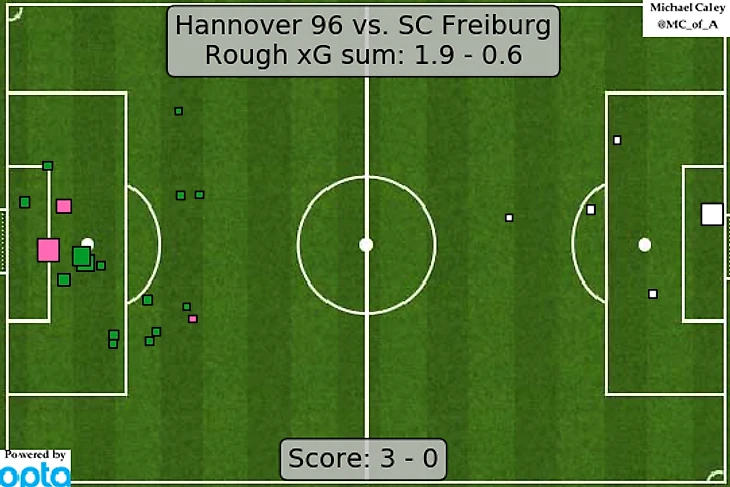 «Ганновер», еще математически боровшийся за сохранение прописки в лиге, на деле решал совсем иные задачи. На волне успеха в матче с «Майнцем» игроки замахнулись на вторую домашнюю победу подряд. «Фрайбург» этому препятствовал не особо – команда давно перешла в режим доигрывания сезона. «Девяносто-шестые» открыли счет лишь с третьей или четвертой попытки. Сказалась расточительность Илы Бебу и четкая игра на последнем рубеже в исполнении Шволова. В концовке первого тайма не выручил и он: дальний навес Приба со штрафного нашел голову Антона – 1:0. Настойчивый тоголезец сказать свое слово смог. На старте второй половины Бебу оторвался от защитника и замкнул прострел с фланга. Благодаря этому голу африканец вышел на чистое второе место в списке бомбардиров команды (4 мяча). Больше только у пришедшего из любителей Вейдандта – шесть. Довершить разгром «брайсгау» ганноверцы решили шедевром. Бакаложу ударом через себя поразить ворота не удалось, но через несколько минут шикарный дальний выстрел оформил Уоллас. По результатам параллельных игр стало ясно, что «девяносто-шестые» точно покинут Бундеслигу. Через неделю в Дюссельдорфе «Ганновер» попробует все же убрать позорный ноль в графе выездных побед, а «Фрайбург» постарается оставить с аналогичной «баранкой» еще одного аутсайдера, «Нюрнберг».