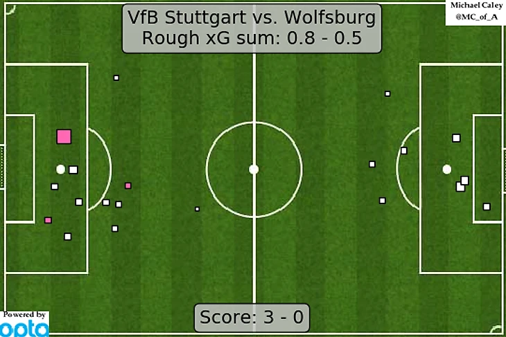 «Швабы» начинали довольно уверенно и прагматично, однако уже на четвертой минуте стадион «Мерседес-Бенц Арена» огласился недовольными криками болельщиков, да и игроков – защитник «Вольфсбурга» Виллиам сбил Николаса Гонсалеса в штрафной мощным ударом. Однако всемирно известный рефери Феликс Брых был непреклонен даже после пересмотра эпизода в повторе. Впрочем, после этого фортуна повернулась к «швабам» лицом, в то время как шансы «Вольфсбурга» на еврокубки теперь остались довольно призрачными. Защита «волков», впрочем, в первом тайме была весьма прочна – первый гол швабов случился буквально за несколько секунд до перерыва. Хозяева ловко перебросили мяч в атакующую треть, и удачным обрезом отлично воспользовался Гонсало Кастро, закативший мяч в дальний угол ворот.