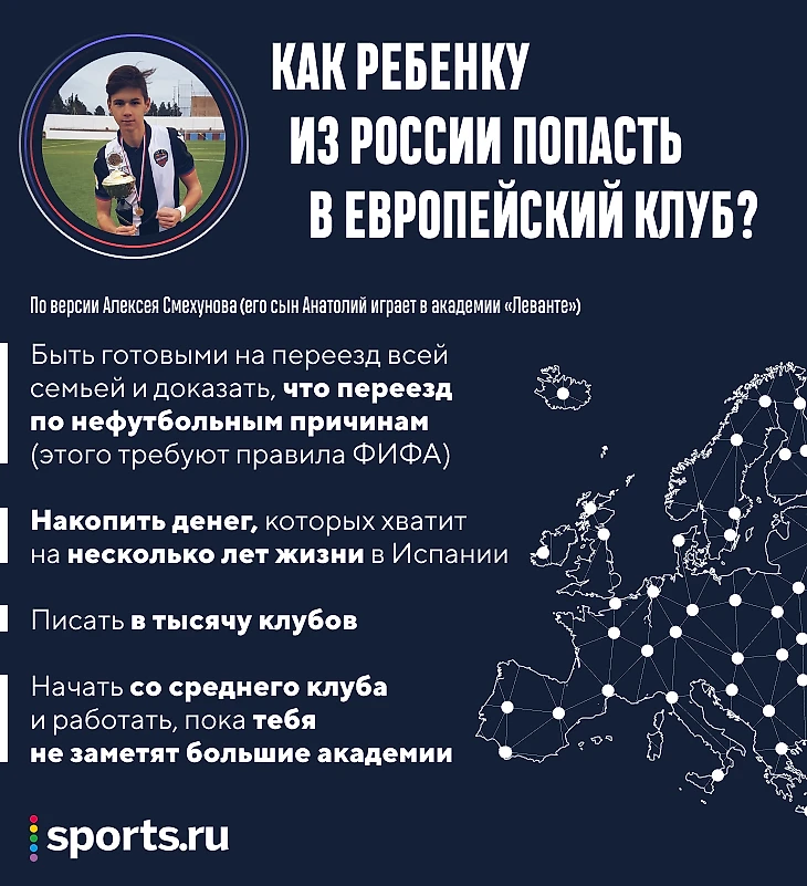 В этом сезоне у Смехунова 7+6 в 35 матчах во всех турнирах (официальную статистику для его возраста еще не ведут, данные – со слов папы). Он приехал в Испанию в августе 2017-го и через год попал в академию «Леванте», несмотря на то, что ФИФА запрещает трансферы несовершеннолетних игроков (до 18 лет). Но в правилах есть три исключения: