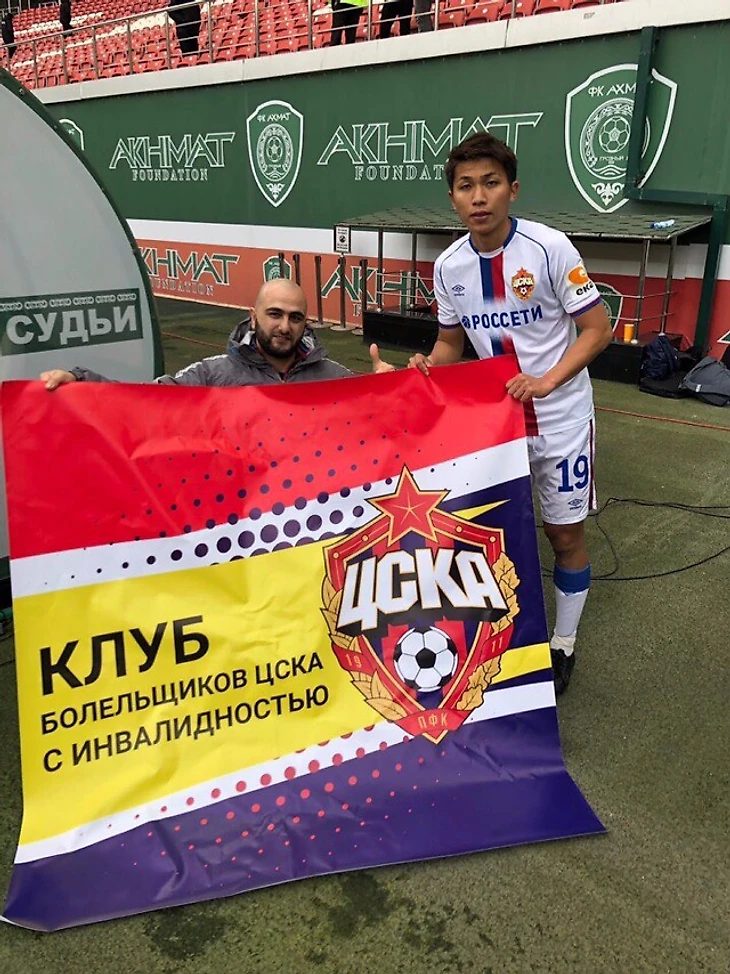 Азали, болельщик ЦСКА, проживает в столице Чечни. И он не только побывал на матче, но и принёс баннер с логотипом Клуба болельщиков ЦСКА с инвалидностью.