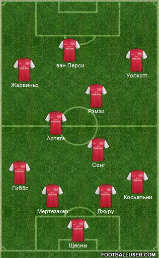 "Арсенал" (4-1-2-3): Щесны - Косьельни, Мертезакер, Джуру, Гиббс - Сонг, Артета, Рэмзи - Уолкотт, Жервиньо, ван Перси.