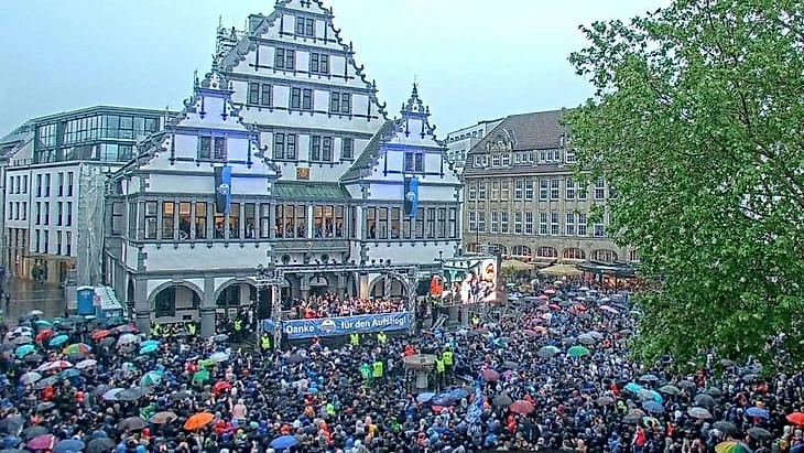• В Падерборне ярко отметили возвращение в элиту: перед городской Ратушей собралось около 10 тысяч жителей, игроков встречали как чемпионов. Не испугал даже проливной дождь.