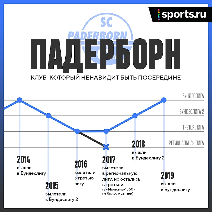 • Подъем «Падерборна» связан с тренером Штеффеном Баумгартом. Он возглавил команду в апреле 2017-го, набрал 11 очков в последних пяти матчах сезона и заслужил продление контракта (от вылета в четвертую лигу не спас, но помог «Мюнхен-1860»). Через два года Баумгарт вывел «Падерборн» в бундеслигу.