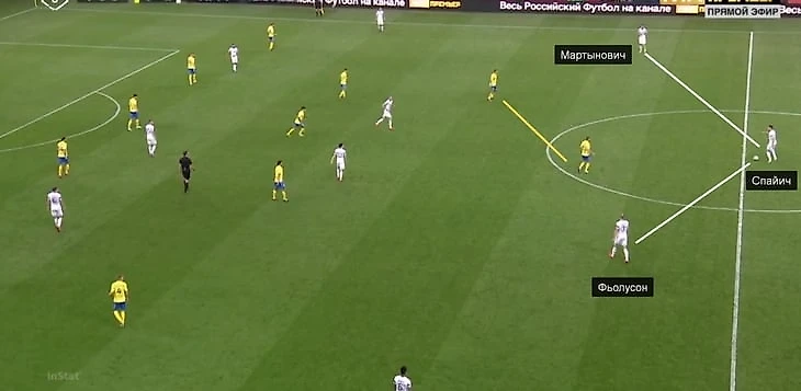В майском матче с «Ростовом» Мусаев сильно удивил стартовым составом: в нем вместе оказались Мартынович, Спайич и Фьолусон. Казалось, что «Краснодар» сыграет с тремя чистыми центральными защитниками, но вышло не так: при атаках соперника Фьолусон располагался в опорной зоне, опускаясь к Мартыновичу и Спайичу лишь в первой фазе позиционной атаки «Краснодара». В таких ситуациях исландец находился ближе к левому флангу.