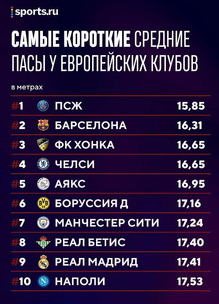ПСЖ и «Барселона» заняли два первых места в рейтинге европейских команд с самой малой средней дальностью пасов, составленном CIES Football Observatory.европейских команд (не только из топ-5 чемпионатов) с самой малой средней дальностью пасов.