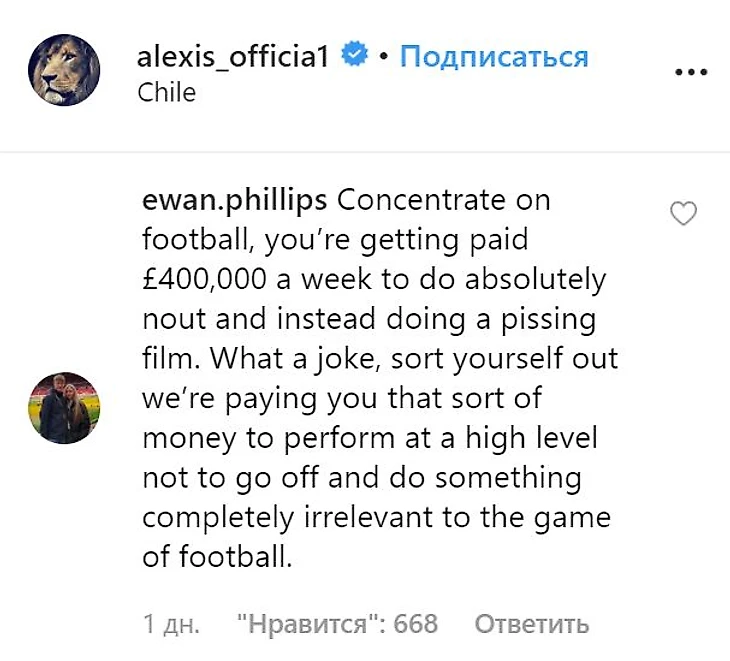 Конечно, самый популярный комментарий намекнул Санчесу про зарплату: «Cконцентрируйся на футболе, а не на каких-то фильмах. Ты получаешь около 400 тысяч фунтов в неделю и даже не пытаешься играть на уровне! Это какая-то насмешка».