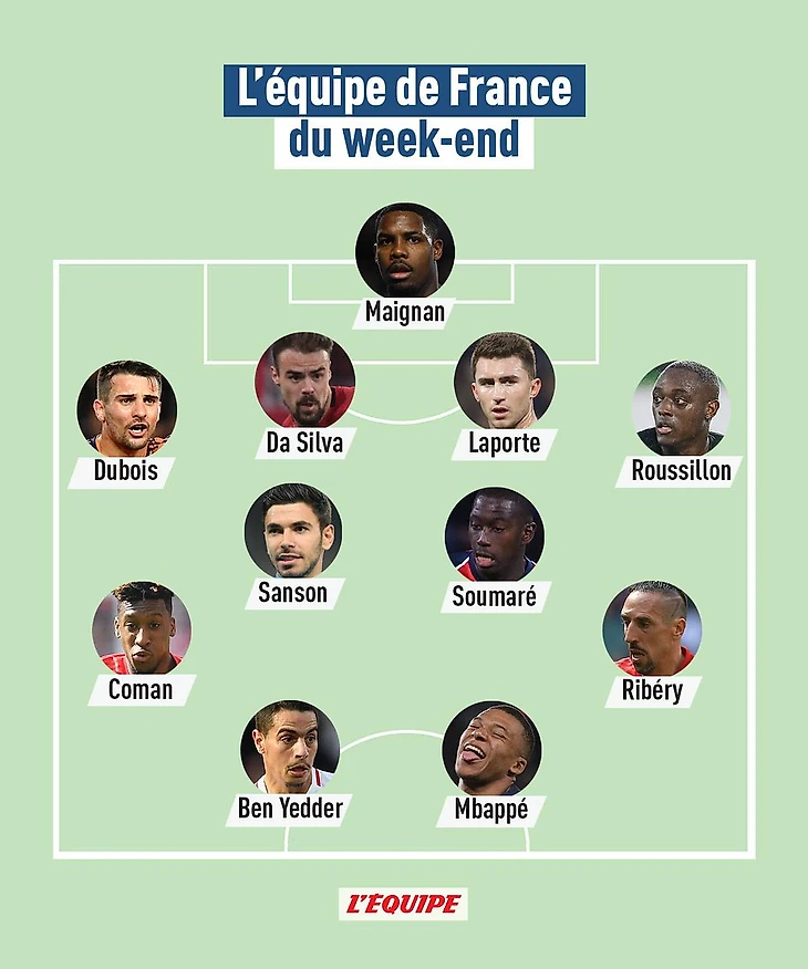 Майк Меньян ("Лилль") - Жером Руссийон ("Вольфсбург"), Эмерик Лапорт ("Манчестер Сити"), Дамьен Да Силва ("Ренн"), Лео Дюбуа ("Лион") - Франк Рибери ("Бавария"), Бубакари Сумаре ("Лилль"), Морган Сансон ("Марсель"), Кингсли Коман ("Бавария") - Килиан Мбаппе (ПСЖ), Виссам Бен Йеддер ("Севилья").