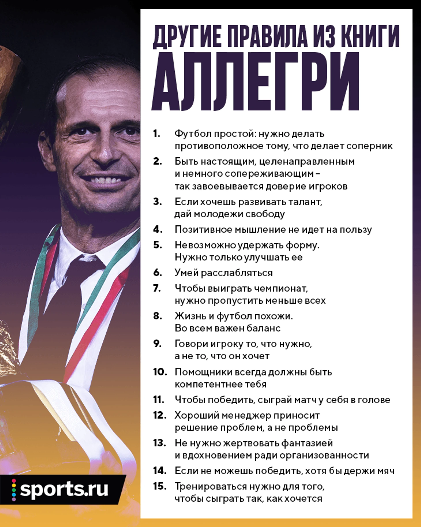 Аллегри написал книгу: это целый свод правил. Объяснил, почему анализирует матчи всего 15 минут