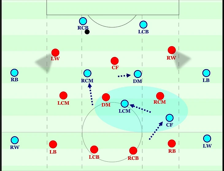 Необходимо прессинговать так, чтобы игроки соперника получали мяч в центральной зоне, исключая для них возможность осуществлять горизонтальные передачи, иначе они смогут растягивать оборону Ливерпуля как вертикально так и горизонтально.
