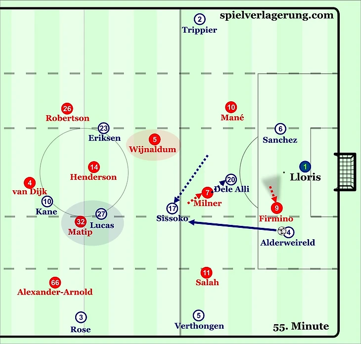 Фирмино начинает прессинг, Милнер, уходит за Алли, А Сиссоко открывается ему за спину под вертикальную передачу от центрального защитника. Милнера должен был страховать Вейналдум, который оказался в полупозиции.