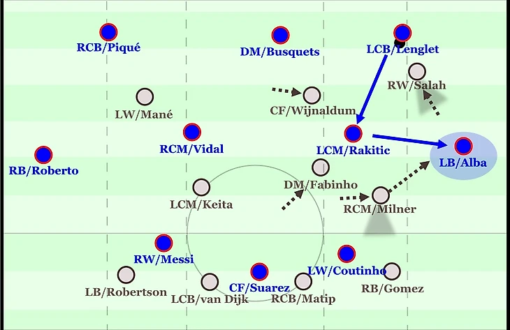 Салах прессингует Лангле, Вейналдум видя возможность передачи на Ракитича смещается, следом за ним перемещаются остальные игроки Ливерпуля, сокращая для полузащитника "Барселоны" возможность для паса. В случае, если Гомез не сможет выдвинуться на Альбу, то перекрывать фланг отправится Милнер. За счет этого командного движения сокращается количество вариантов для продвижения "Барселоны" вперед через короткий пас.