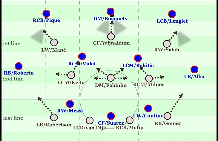 Классическая расстановка игроков Ливерпуля при прессинге. Игроки первой линии прессингуют центральных защитников и Бускетса, расположившегося с ними на одной линии, и перекрывают линию паса на фланги. У каждого из игроков второй линии Ливерпуля по два оппонента, начала движения которых они и ждут. Крайние защитники готовы прессинговать Альбу и Роберто.