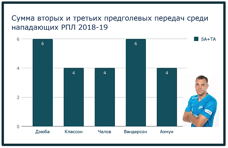 В стадии развития атаки важную роль играет каждая передача, приближающая команду к голу. В современном футболе всё чаще прибегают к детальному анализу игровой комбинации, предшествующей взятию ворот. Важное значение в игре имеет не только сама голевая передача, но и как минимум два паса, которые следовали до неё. По аналогии с хоккеем в современном футболе всё больше можно слышать о втором и третьем ассистентах, т. е. об авторах второго и третьего предголевого паса соответственно. Сумма таких передач показывает очевидную эффективность игрока в финальной стадии билдапа. На диаграмме ниже лидеры РПЛ среди нападающих по общему числу вторых и третьих предголевых пасов.