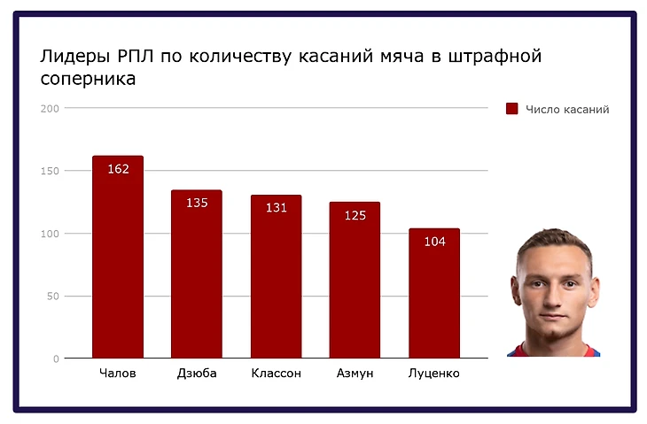 Оценим умение нападающих РПЛ открываться в непосредственной близи ворот. Одним из показателей, способным охарактеризовать данное игровое качество форварда, является общее количество касаний им мяча в штрафной соперника. Лидером лиги по этому показателю на протяжении всего сезона является Фёдор Чалов, Дзюба на втором месте. Учитывая описанное выше умение Артёма отдать креативную последнюю передачу, можно говорить о серьёзном диапазоне возможностей развития предударной фазы атак "Зенита" в непосредственной близости ворот соперника.