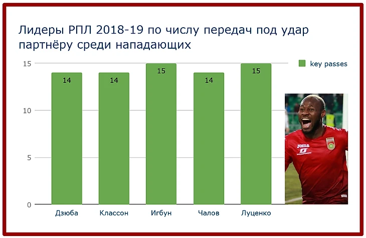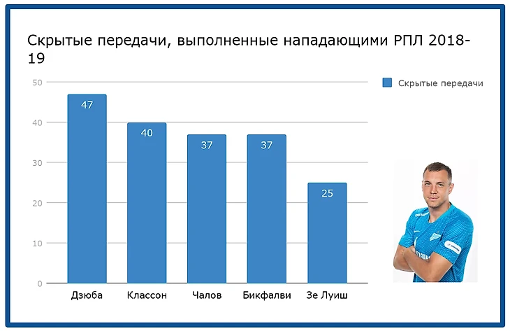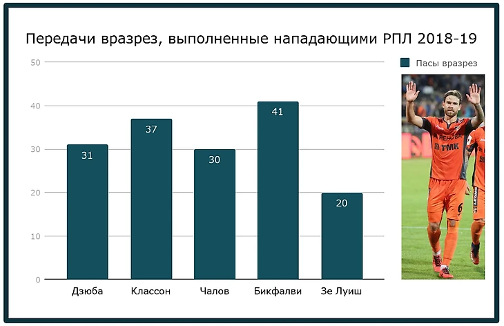 1). Общее число передач вразрез показывает реакцию отдающего на рывок партнёра в свободную зону. По этому показателю Дзюба один из лидеров РПЛ среди нападающих, уступая Классону и Бикфалви.