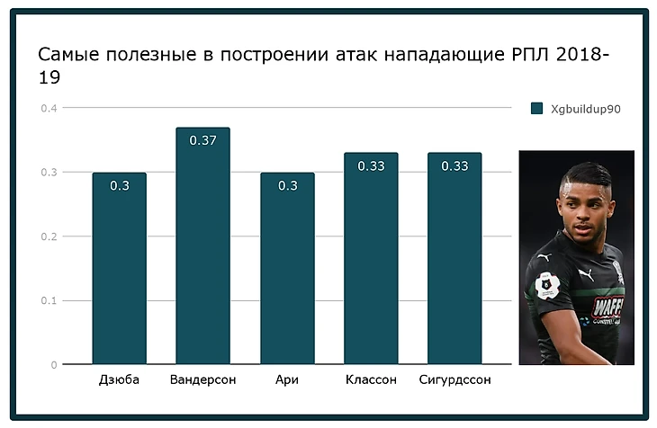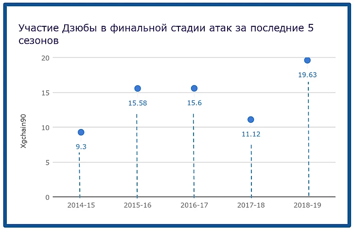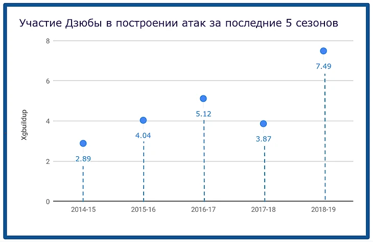 По данному показателю Дзюба также один из лидеров РПЛ и лучший среди нападающих "Зенита". В фазе построения атак, завершающихся ударом, Артём незаметно стал ключевым игроком питерского клуба. Минувший сезон стал для Дзюбы лучшим за последние 5 лет по суммарному показателю “Xgbuildup”.