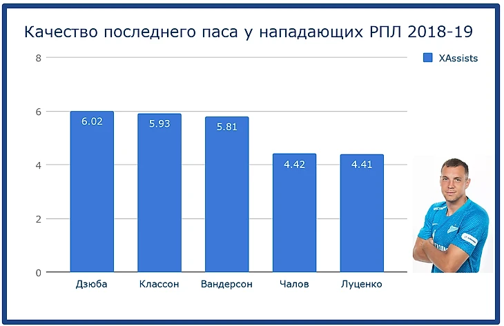 По качеству последнего паса Дзюба лидер РПЛ среди нападающих, а среди всех игроков немного уступает только Николе Влашичу и Алексею Миранчуку. По реально выполненным голевым передачам в сезоне (11) Артём единоличный лидер чемпионата России.