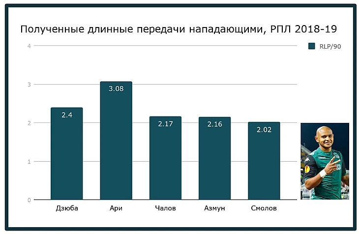 Сначала рассмотрим влияние Дзюбы на построение атак "Зенита" при Семаке. Умение Артёма принять длинную передачу и продолжить движение мяча вперёд стало одним из ключевых для билдапа питерского клуба. Каждый раз, когда команда с берегов Невы испытывала трудности с выходом в атаку низом через центр, на помощь приходил Дзюба. Рослый нападающий «Зенита» одинаково хорош и в обработке длинной передачи, и в умении выполнить точную скидку мяча, что помогало питерскому клубу преодолевать насыщенный центр поля и переходить в атакующую треть. На диаграмме ниже среднее количество принятых верховых пасов за матч нападающими РПЛ в сезоне 2018-19 . По этому показателю Дзюба уступает только Ари, также безумно хорошему в этом игровом аспекте.